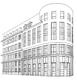Fortführung des vorhandenen Fassadenrhythmus mit modernen Mitteln. Abrundung der städtebaulich dominanten Gebäudespitze.